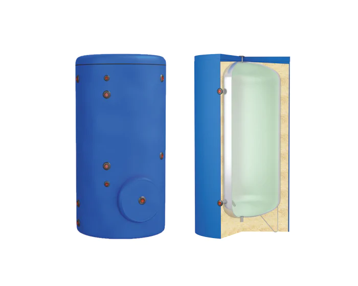 Volume : 1000 L. Isolation montée en série en M3 avec laine de verre souple de 100 mm, écologique et exempt de CFC. Isolation démontable. 3 piquages pour résistance électrique et thermomètre. Vidange par manchon débouchant sur le bas.