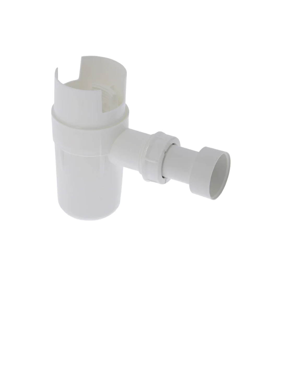 Corps plastique blanc orientable 360° pour liaison NF entre groupe de sécurité ¾" et évacuation DN 25/32. Pose rapide, gain de place et débit normalisé garanti.